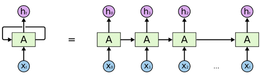 A chunk of neural network, “A”, looks at some input x(t) and outputs a value h(t). X(t) could be a word or a sentence, and h(t) is the probability of the next word or next sentence.